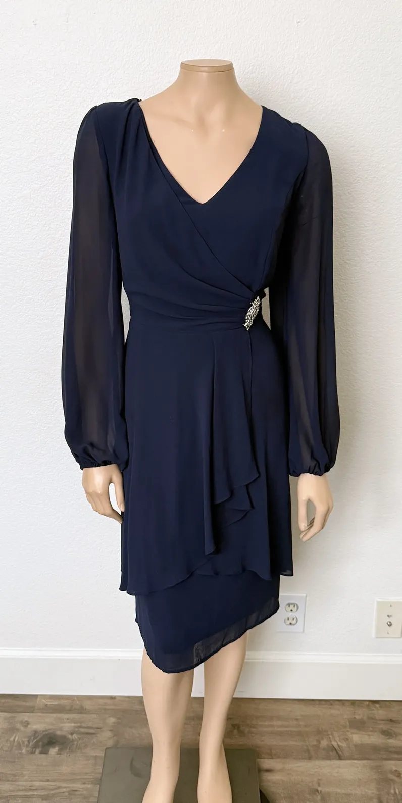 Marina Sz 12 Navy Blue Chiffon V-Neck Faux Wrap Brooch Balloon Sleeve Midi Dress Good, Pre-Owned Condition Size: 12 Brand: Marina Color: Blue Long semi-sheer balloon sleeves Back zip closure V-neck front Front faux wrap gathered detail with sparkle crystal rhinestone brooch Midi length Ruffle detail adds some dimension Lined Small stain below the brooch as shown but not quite visible while worn Perfect as a mother of the bride dress or wedding guest dress! 100% Polyester Measurements: Bust: 20 inches Waist: 16.5 inches Length: 42 inches