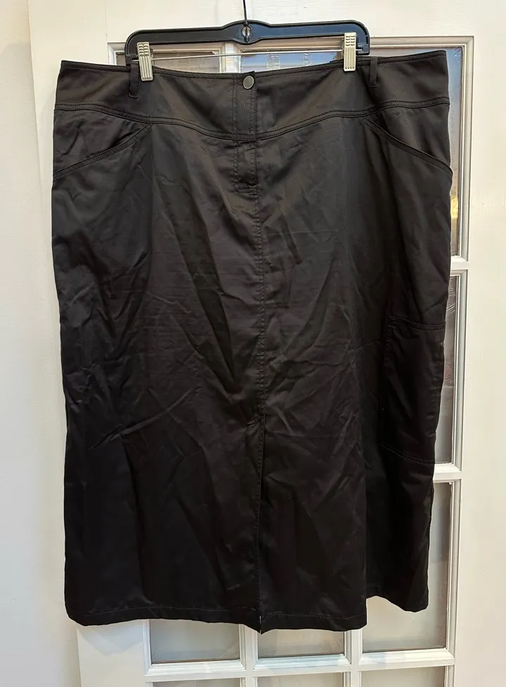 Chic black midi skirt by Marina Rinaldi. Versatile and stylish. Perfect for any occasion. Excellent, preowned condition, no flaws, just a few wrinkles Measures as a 3X to 4X - see measurements in photos Smoke free home
