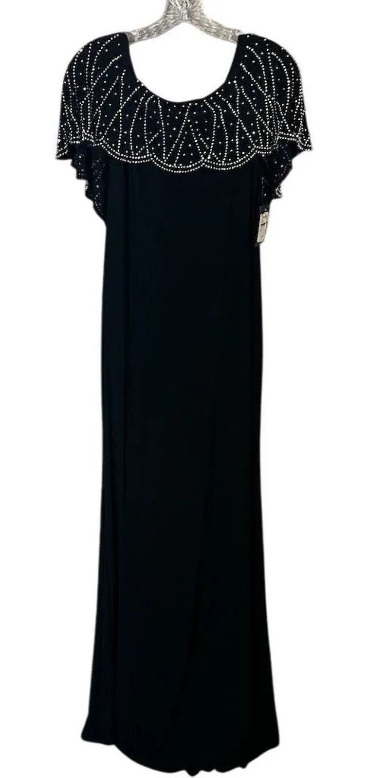 This Marina dress is a size 4, regular fit, designed for formal occasions. It features a beaded capelet style with a V-back and is long in length. The dress is black and made from a blend of polyester and elastane. It requires hand washing and is made in the United States. The condition is new with tags. Brand: Marina Size: 4 Style: Beaded, Capelet, V-Back Dress length: Long Color: Black Department: Women Occasion: Formal Material: Polyester, Elastane Garment care: Hand Wash Only Country of origin: United States -Brand new without tags -Please View Picture For Fabric Content -18.5” Pit to Pit -60.5” L -All orders are shipped the following business day. -Thanks for your interest
