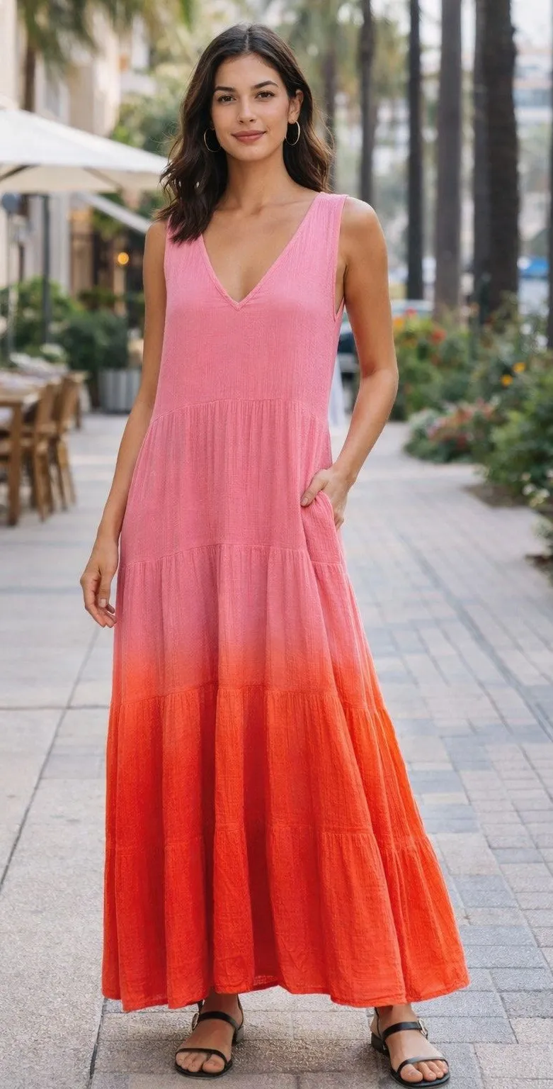 -First photo is AI model to visualize style and fit; see item photos for actual item and condition- Gorgeous pink to coral/red ombre dip-dye. Lightweight 100% cotton gauze with a relaxed, flowy silhouette and tiered skirt—perfect for summer, beach, and vacation. Sleeveless with a V-neckline and pockets. Size XS but has an easy relaxed/oversized fit and may also work for a Small depending on desired fit (please refer to measurements). Measurements (flat): Pit to pit: 17” Length: 51” Recent issue (released last summer). Great pre-owned condition. beach dress, resort wear, vacation outfit, pockets, coastal grandma, barbiecore, sunset colors, summer dress, sleeveless maxi, boho maxi, flowy, coastal, resort, boho, vacation