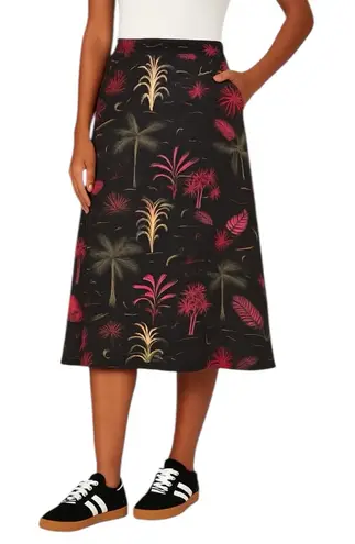 IN EXCELLENT PRELOVED CONDITION SIZE: 6 Beautiful Marine Layer midi skirt in a bold tropical landscape print featuring palms, sunsets, and abstract linework in pink, gold, and green tones against a dark background. Effortlessly easy and breathable with a soft drape. Details • Side zipper closure • Midi length with relaxed, flowy silhouette • Tropical palm print in vibrant multicolor • Unlined; lightweight Fabric • 54% Hemp • 44% Tencel Lyocell • 2% Spandex Soft, airy, and naturally breathable with a bit of stretch. Measurements (approx., flat) • Waist: 15” • Length: 33”