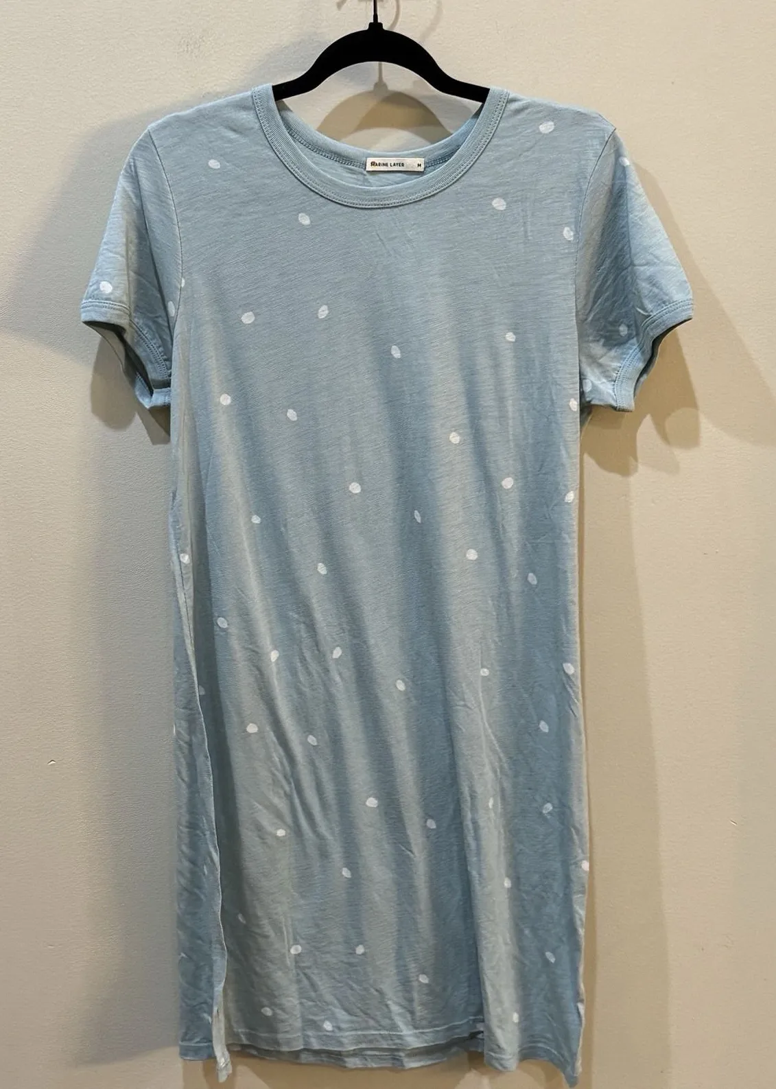 Slip into comfort with the Marine Layer Reese T-shirt Dress, a casual staple that combines effortless style with a cozy feel. The charming polka dot pattern adds a playful touch to your wardrobe, while the knit cotton blend ensures breathability and ease of movement throughout your day. The dress features a classic crew neck and short sleeves, perfect for transitional weather or a laid-back beach outing. Machine washable and easy to maintain, this multicolor piece in size medium is a versatile addition to any fashion-savvy woman's collection. 2100. 2228. 20 1/2 inches pit to pit.