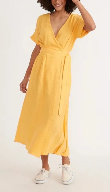 Features: Style: Wrap Dress Size: Large Condition: Excellent condition, no flaws Color: Golden Yellow Brand: Marine Layer Material: Gauze Adjustable wrap style The pockets were very bulky on the fit of this so they were altered to not be functional. There are effectively no pockets. Smoke-free home I ship promptly Check measurements for precise fit Measurements are taken lying flat, see photos in the listing