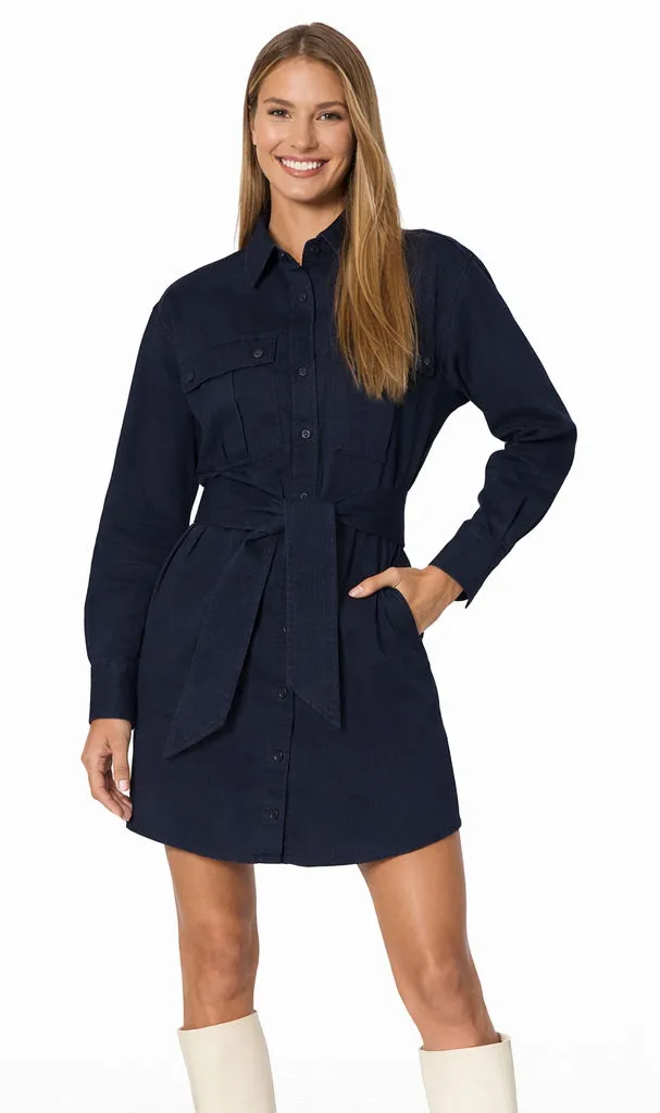 Good Pre-owned Condition. Original Retail Price: $345 A trendy tie at the waist gives subtle definition to this Marissa Webb Collective shirtdress styled with utility appeal. Navy Blue twill Denim shirt dress. Collared. Long sleeves. Front button closure. Side seam pockets. Belted. 2 front flap covered pockets. Button cuff sleeves. Bust pit to pit 21". Length is approximately 34". Sleeve 21". Occasion / Style: Workwear, office, business casual, everyday chic, coastal cowgirl styling Style Aesthetics: quiet luxury, minimalist, modern classic, workwear, coastal cowgirl WN9 031325
