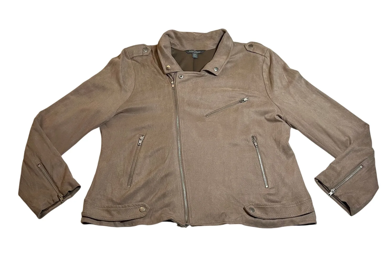 CONDITION: Pre-Owned. Excellent Used Condition. FLAWS/ALTERATIONS: There is a faint stain. Please see the last picture. COLOR: Taupe Brown SIZE: Women’s Size XXL DETAILS: Long sleeve Asymmetrical full zip Zipper pockets Lined Faux suede Collar MEASUREMENTS: Chest: 23.5" Full Length: 24" **All measurements are approximate and are taken flat** MATERIAL: BODY: 93% Polyester 7% Spandex LINING: 100% Polyester Bundle 2 OR MORE items to save more! Reasonable offers are welcomed! TAGS: Casual Comfy Fall Winter Contemporary Minimalist Neutral Preppy Classic Staple Corpcore Corporate Office Workwear Career Professional Capsule Wardrobe Effortless Trendy Edgy Chic Date Night Moto Biker Outdoors Outerwear Concert Party Plus Size Curvy