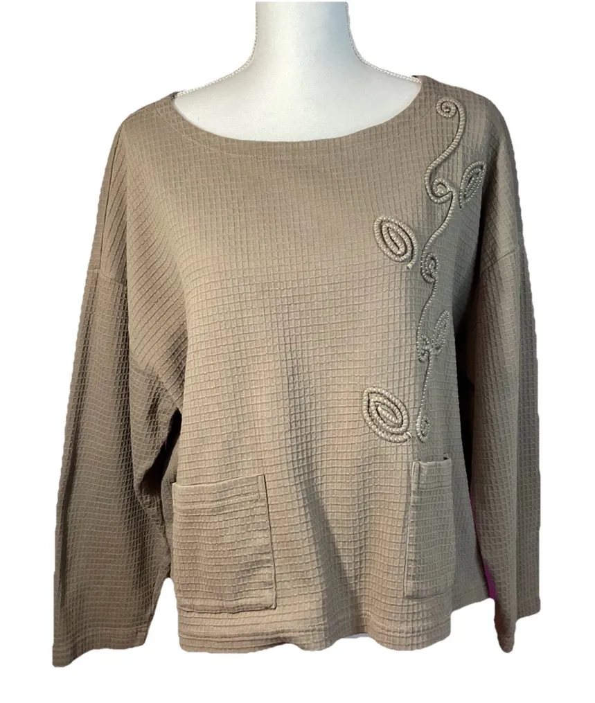The Marketplace Handwork of India Taupe Waffle Knit Top with Leaf Embroidery is a stylish and comfortable tunic-style top designed for women. Made from 100% cotton knit fabric, this size 1W top features a relaxed fit with a round neck and 3/4 kimono sleeves. The waffle pattern and leaf embroidery add a unique touch to this brown-colored top, making it a versatile piece that can be worn for various occasions. Crafted in India, this top is perfect for women looking for a blend of quality and style in their wardrobe. Preowned in excellent condition Size 1W Relaxed Fit Please see All photos for measurements Comes from a smoke free home 13125