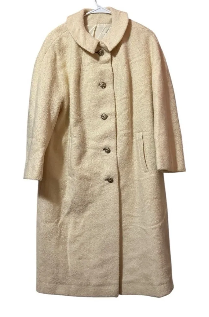 This coat is vintage and in really good used condition. I cannot find the material or size tag. I believe it may be wool. I have included measurement photos. Please check them closely before purchasing. ***Please be advised, color may appear more vibrant, lighter/darker in pictures due to flash, contrast, lighting or your phone/computer screen set up, etc. I try to described color as best as possible. I do check every item very closely while taking pictures and while packing it for shipping but it is very easy to still miss a stain or small damage. So please, if you receive an item with a defect not mentioned on the description, message me and I will do my best to fix the problem. Thank you! This item is pre-owned. Any questions please dont hesitate to ask.