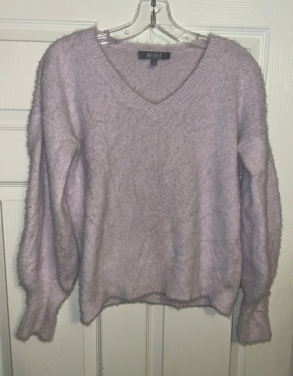 Embrace effortless chic with this luxuriously soft lilac fuzzy sweater. Its inviting V-neckline and playfully voluminous sleeves create a silhouette that's both comfortable and stylish. The plush, tactile knit promises to envelop you in warmth and comfort, making it a delight to wear. Perfect for a cozy night in, a casual brunch with friends, or adding a touch of gentle color to your everyday ensemble. Style: Pullover Department: Women Material: Nylon, Acrylic Neckline: V-Neck Type: Sweater Sleeve Length: Long Sleeve Features: Stretch, Breathable, All Seasons Pattern: Solid Sleeve Type: Balloon Sleeve Fabric Type: Knit Keywords: Marled sweater, Lilac sweater, Fuzzy sweater, V neck sweater, Long sleeve sweater, Soft sweater, Cozy sweater, Knit top, Womens sweater, Casual sweater, Fashion sweater, Winter sweater, Spring sweater, Fall sweater