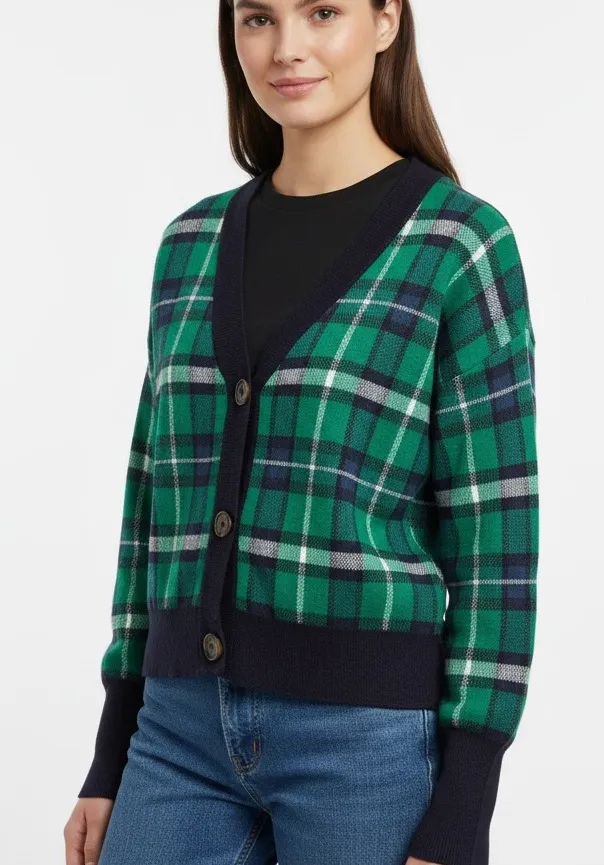 Stay cozy and stylish with this plaid green and navy sweater. Perfect for layering and adding a pop... Show more