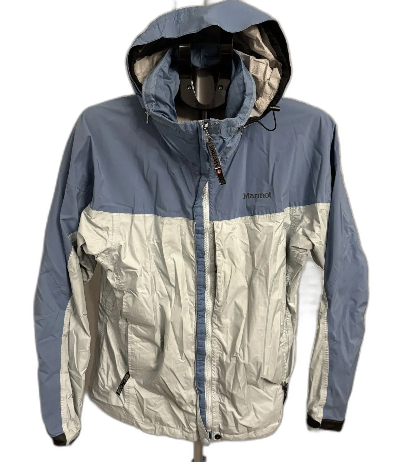 . Has tiny hole on back as pictured. The Marmot Precip Eco Jacket is lightweight, breathable & waterproof. Similar to the Precip Jacket, the Eco is made from recycled material & PFC-Free DWR. The Marmot PreCip Eco Jacket lasts longer than before due to the advanced technology in the microporous coating of the jacket and is small enough to stuff into its own pocket. With an updated fit, DriClime™-lined chin guard wicks away moisture to help prevent chafing, and the same features you know and love from Marmot. Features Marmot® NanoPro™ Waterproof/Breathable Fabric 100% Seam Taped Attached Adjustable Hood that Rolls Into Collar DriClime® Lined Chin Guard PitZips Zippered Hand Pockets Stuffs Into Own Pocket Adjustable Velcro® Cuffs Elastic Drawcord Hem Angel-Wing Movement™ Length: 25" Pit to pit taken flat: 23" Sleeve: 24.5" outdoors, camping, hiking, fishing, boating, rain, windbreaker, waterproof,