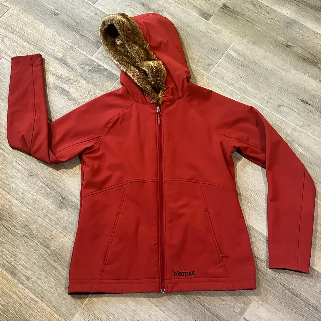 Marmot Red Zip Up Faux Fur Hooded Light Winter Jacket Coat - Women's Large - $55 - From Kristy