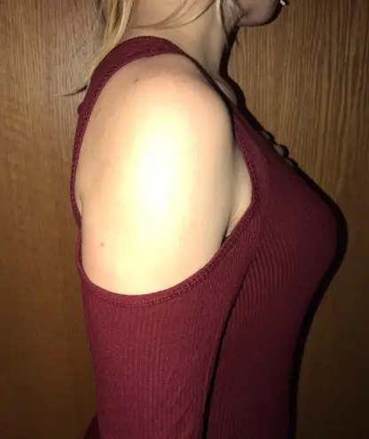 Maroon cold shoulder bodysuit with a keyhole back and button clasp closure. Lightly worn