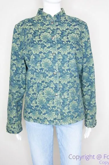 Marsh Landing floral print green blazer, size L 100% cotton Floral print Pleat in the back Long sleeve Stand collar Size L, approx. laid flat measurements: Shoulder: 16'' Chest: 21 1/2'' Length: 22'' Sleeve: 24 1/2'' Missing one button on cuff on each sleeve as shown in the photos. 4028
