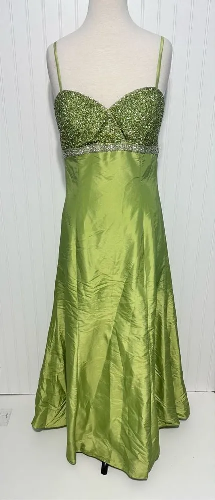 Marsoni Prom Gown Maxi Length Beaded Open Back Sweetheart Neckline Green 14 Size: 14 Condition: New with tags- some of the hook and eyes were reinforced- see photos Features: Slightly Padded bust Embellished sequin bust Open back with embellished strap detail Maxi gown length Zip up closure Tulle lining Formal gown perfect for cocktail party, prom, dance, homecoming, pageants Vintage Label Material: Polyester Measurements: See photos for approximate measurements HNG 2 pounds