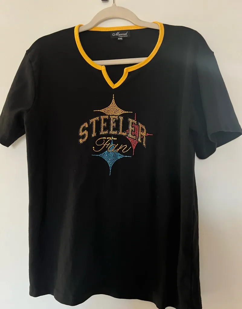 Show your team spirit with this one of a kind sparkle t shirt. This black tee features a dazzling rhinestone design with “STEELER FAN” in gold, plus a starburst emblem in red, gold, and blue. Yellow trim at the neckline adds a sporty pop. 🏈 Women’s Size XXL 🏈 Brand: Old School Authentic 🏈 Good used condition 🏈 Soft, stretchy fit with standout bling Perfect for tailgates, watch parties, or everyday fan flair. Shine bright, rep hard. #SteelersNation #BlingTee #NFLStyle #GameDayGlam #RhinestoneFashion #TeamSpirit #SizeXXL #OldSchoolAuthentic #FanStyle #PoshFinds #PittsburghSteelers #FootballFashion #StatementTee