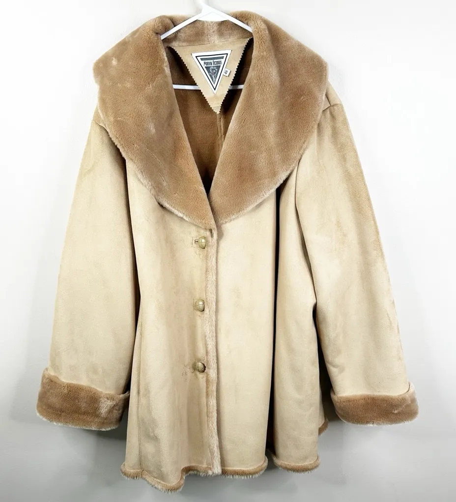 Great condition, Small mark on the back faux fur at the neck- see all photos for details. Overall excellent condition Button front Faux suede body, faux fur trim and lining Pockets Measurements are approximate- Chest- 30" Length- 36" VTG, 90s, 80s, plus size, winter, fall, overcoat, Old money, classic