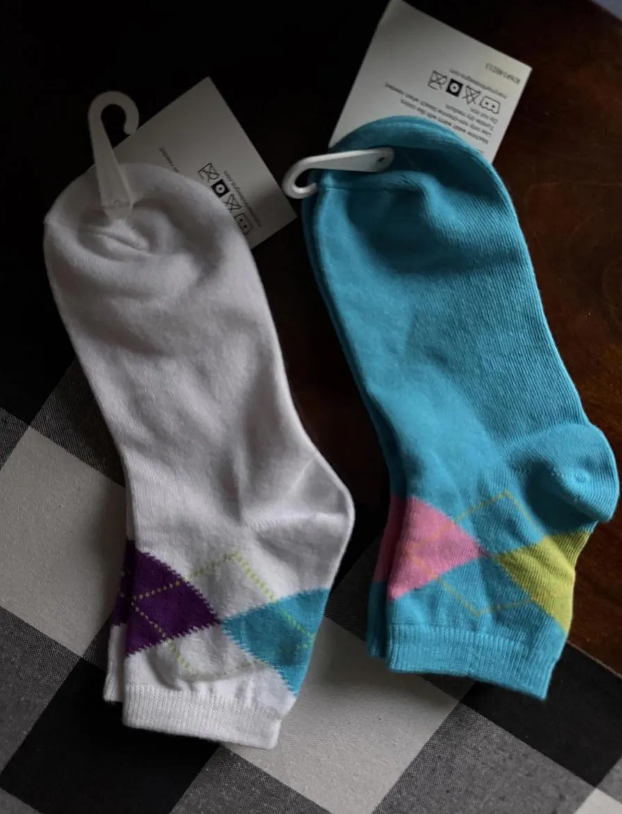 Set of two pairs of women's socks by Mary Martin Designs. One pair is predominantly white with blue, purple, and green argyle pattern. The other pair is mainly poolside blue with pink, yellow, and green argyle pattern. Made of 70% cotton, 28% polyester, and 2% spandex for comfort and stretch. Size 9-11, suitable for women's feet. Machine washable; wash warm with like colors and tumble dry medium. Made in Korea. NWT’s