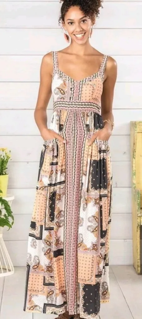 Charming dress with floral patterns. Features a mix of colors and a playful design. Ties in the back... Show more