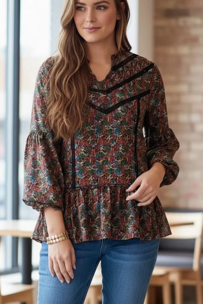 Matilda Jane Floral Blouse Women's Long Sleeve Black Lace Trimmed LG Measurements: Pit to Pit: 21 i... Show more