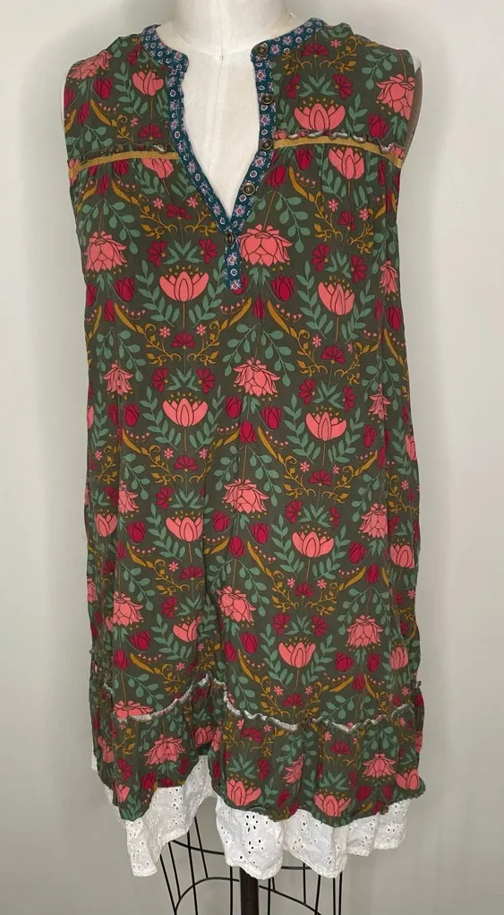 The Matilda Jane Floral Eyelet Lace Ruffle Hem Sleeveless Shift Sundress in size M is a stylish and versatile dress perfect for casual occasions. Made from a comfortable blend of rayon and cotton, this dress features a beautiful floral pattern, ruffle accents, and a round neck with a button closure. The sleeveless design and lightweight material make it ideal for wearing during the summer, fall, or spring seasons. With its short dress length and shift style, this dress is a flattering and fashionable choice for any woman's wardrobe. Excellent condition Armpit to armpit flat 20” Length 34” Measurements approximate