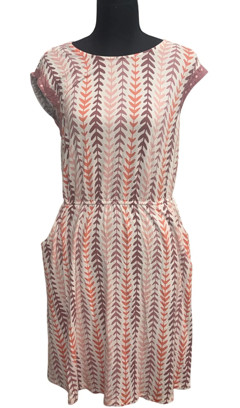 Matilda Jane Fortune Teller Dress from the beloved Happy & Free Collection (2015). This women’s sleeveless, knee-length dress features a soft off-white/cream base with mauve, pink, and orange geometric leaf/chevron print. Designed with an elasticated waist for comfort and shape, functional side pockets, and charming cap sleeves with contrasting polka-dot trim visible at the lining. Easy, flattering, and quintessential Matilda Jane whimsy. Condition Good used condition due to age and light wash wear only. • No holes • No stains • Elastic waist is intact and functions properly • Side pockets fully functional Clean and ready to wear. DetailsBrand: Matilda Jane Style Name: Fortune Teller Dress Collection: Happy & Free (2015) Size: Women’s Small Length: Knee-length Features: Elastic waist, side pockets, round neckline, cap sleeves Colors: Cream/off-white with mauve, pink, and orange pattern Please review photos for overall condition and fabric details. Measurements available upon request.