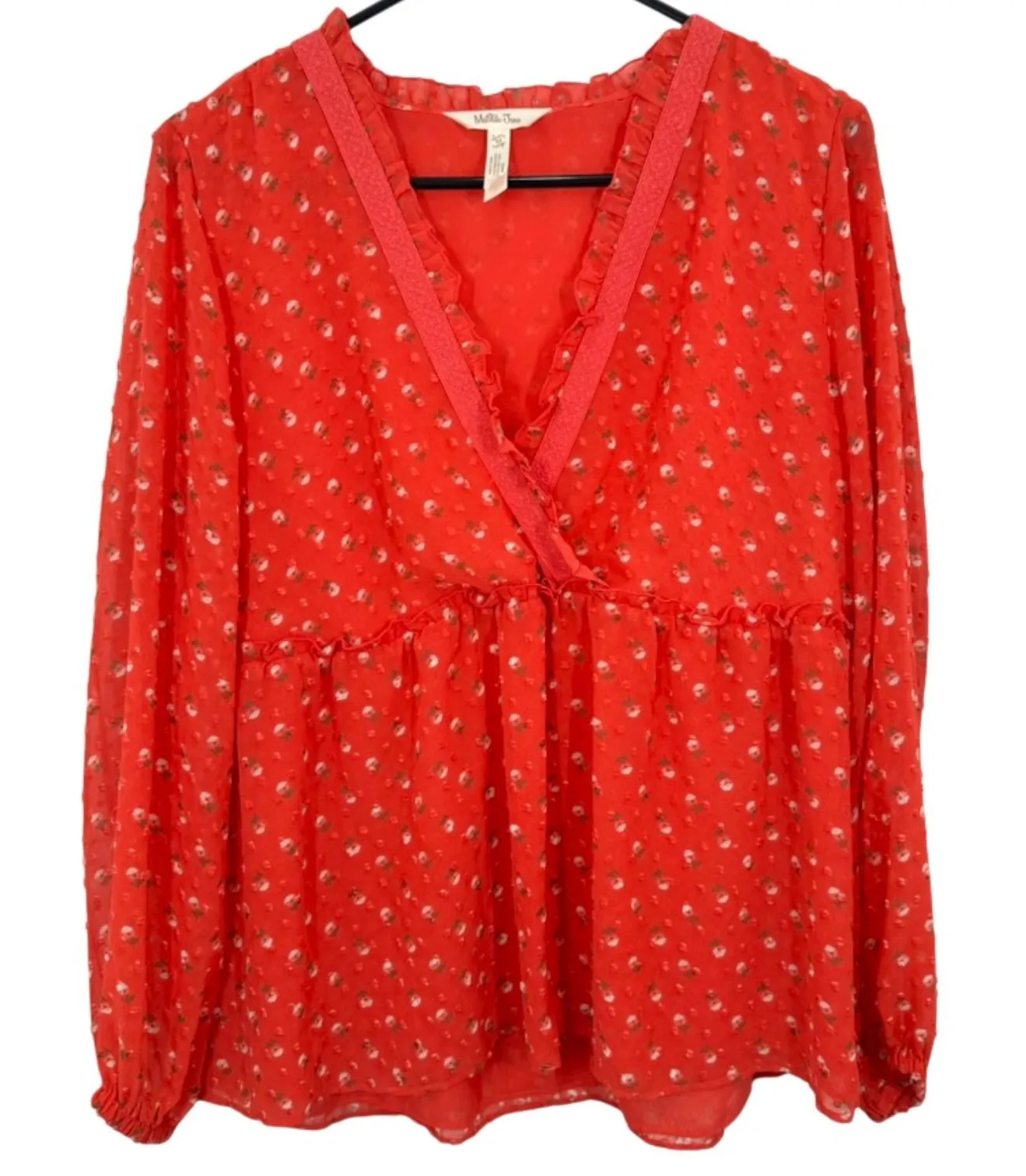 Matilda Jane Red Floral Sheer Babydoll Peasant Blouse Long Sleeve Cottagecore Pre-Owned in Great Condition Approximate Measurements: Length: 27" Pit-Pit: 20" Embrace effortless charm with this vibrant red peasant blouse from Matilda Jane. Its sheer chiffon fabric drapes beautifully, creating a light and airy silhouette that dances with every movement. Delicate floral embroidery in shades of pink and green adds a whimsical touch, while the ruffled V-neckline and empire waist create a flattering, feminine shape. The bishop sleeves, finished with elasticized cuffs, lend a graceful volume, making this top perfect for a casual brunch, a garden party, or a romantic evening out.