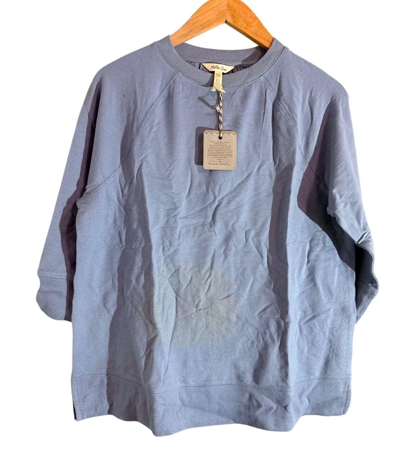 Embrace effortless charm with this delightful Matilda Jane top, a dreamlike piece designed to make you feel beautiful. The soft, sky-blue hue washes over you, while the delicate eyelet embroidery along the hem adds a whisper of romantic whimsy. Raglan sleeves create a relaxed silhouette, perfect for comfortable wear, and the subtle gathering at the back yoke adds a touch of refined detail. Imagine yourself strolling through a farmer's market on a sunny Saturday, enjoying a leisurely brunch with friends, or embracing a casual yet chic look for a relaxed evening out. Type: Blouse Department: Women Style: Tunic Material: Cotton Blend, Cotton, Blend Neckline: Crew Neck Sleeve Length: 3/4 Sleeve Sleeve Type: Raglan Sleeve Pattern: Solid Accents: Embroidered Theme: Boho Chic, Designer, Spring Fashion Features: Lightweight Fit: Relaxed Keywords: Matilda Jane top, women's blue top, embroidered eyelet shirt, 3/4 sleeve top, raglan sleeve shirt, casual blouse, boho top, feminine top, new with tags top, designer top, spring top, summer top, light blue top, women's apparel, ethical fashion