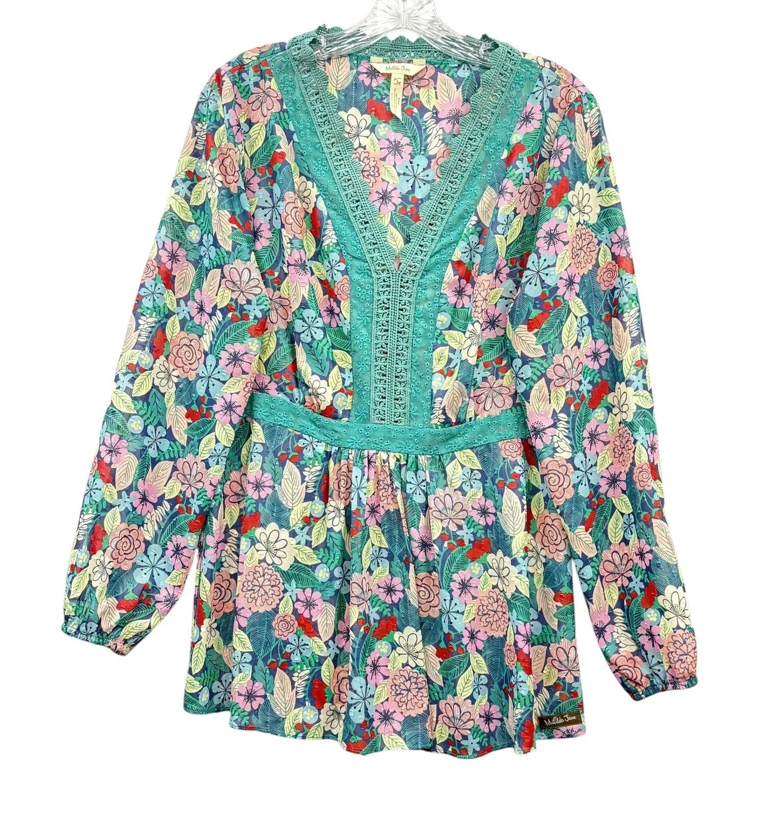 Matilda Jane Women's Floral Print Long Sleeve Blouse Lace Trim Peasant V Neck Gently Used Eye-catch... Show more