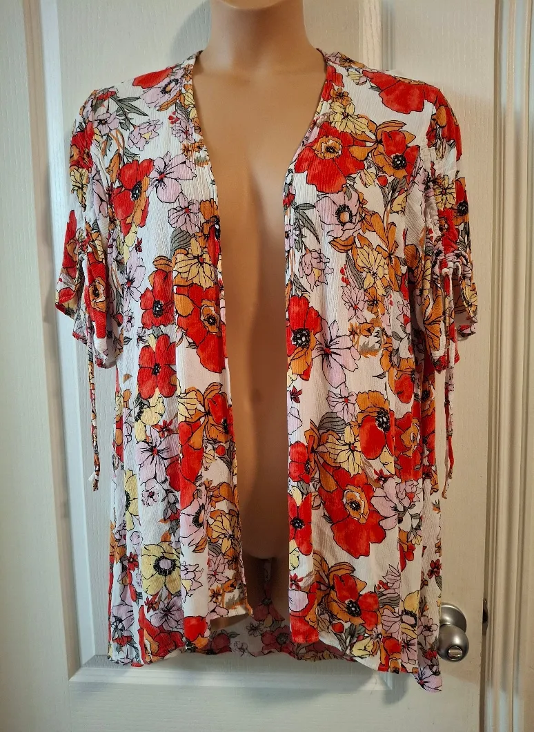 This vibrant floral kimono cardigan features a stunning mix of red, orange, and white hues. Perfect... Show more