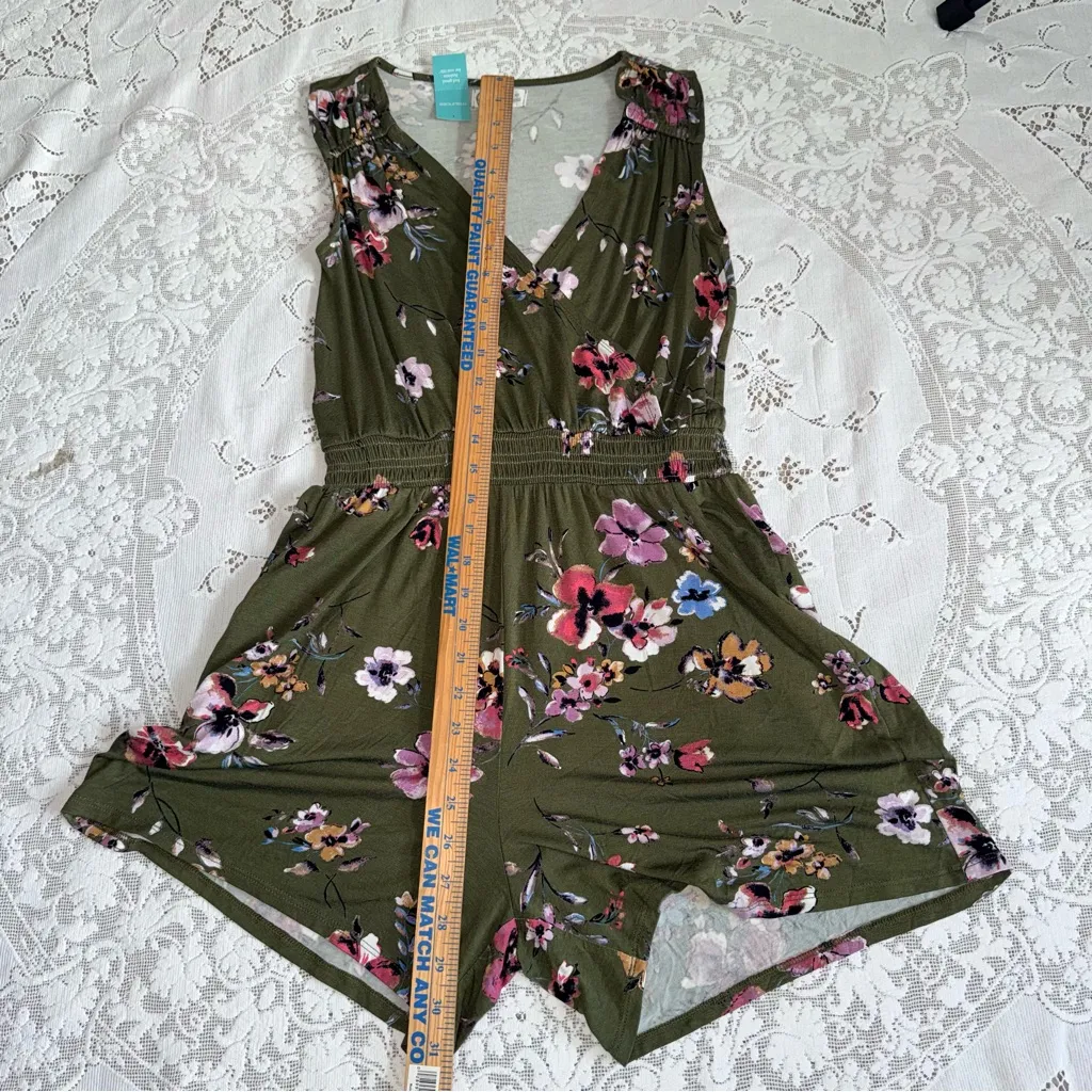 NWT Maurices 24/7 Floral Faux Wrap Romper Jumpsuit Shorts Green Pink XS Boho This is a beautiful, brand-new with tags (NWT) romper from Maurices' super-comfy 24/7 line! The fabric is soft, stretchy, and perfect for warm weather or layering. • Brand: Maurices (24/7 Line - "Feel good fashion for real life") • Size: Women's X-Small (XS) • Color: Olive Green / Army Green / Khaki with a vibrant Multicolor Floral Print (pinks, mauves, purples, corals, cream) • Style: Sleeveless Romper, Faux Wrap / Surplice V-Neck, Smocked / Ruched Elastic Waist, Short-length shorts. • Features: • Flattering faux-wrap V-neckline. • Elastic/smocked waist for a comfortable, defined fit. • Sleeveless with a ruched shoulder detail. • Soft, comfortable, and stretchy knit fabric (likely a rayon/spandex blend based on the tag's line/style). • New With Tags (NWT) - Style Number: 206772 📏 Approximate Measurements (Flat Lay) (Taken from your image with the ruler) • Length (Top of Shoulder to Hem): Approx. 31.5 inches • Bust (Armpit to Armpit across chest): Approx. 14 inches (The wrap/stretch fabric allows for flexibility) • Waist (Across Smocked Waist, un-stretched): Approx. 11 inches (Will stretch considerably)