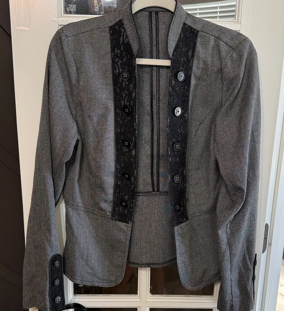 This sophisticated MAURICES mandarin collar blazer features a classic black & gray tweed with elegan... Show more