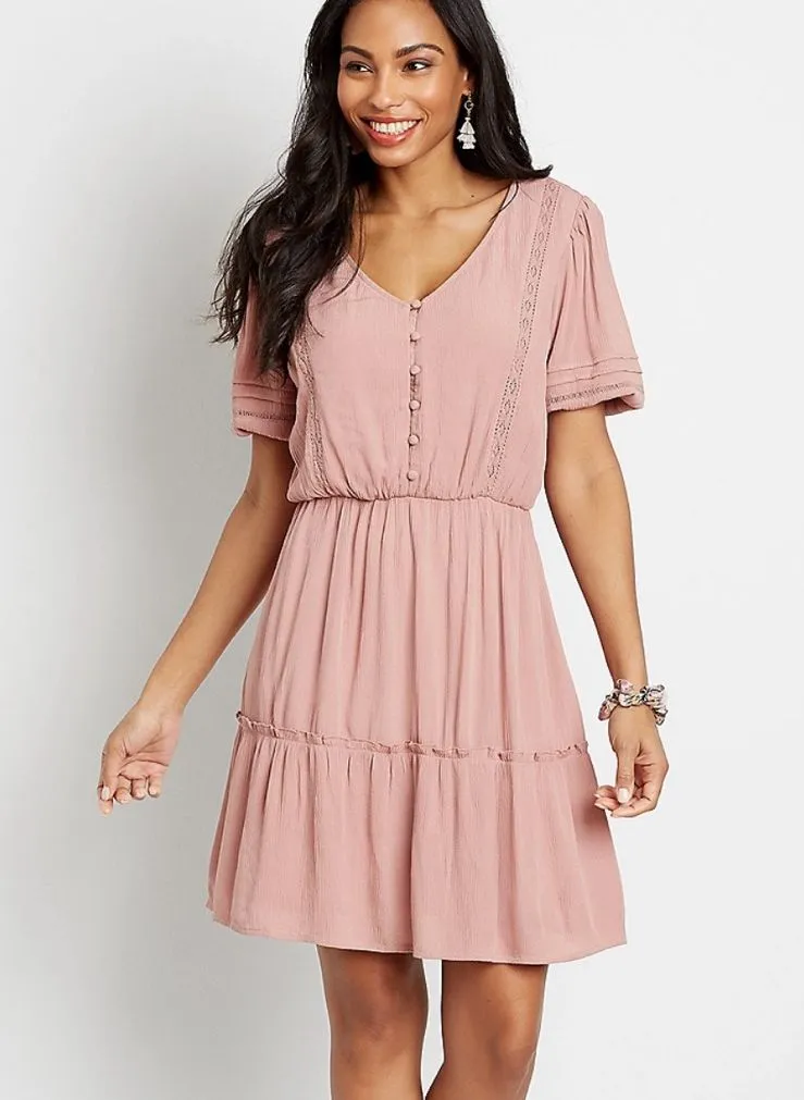Beautiful dusty rose pink button front dress with lace inlay details. Lightweight and airy, with a... Show more