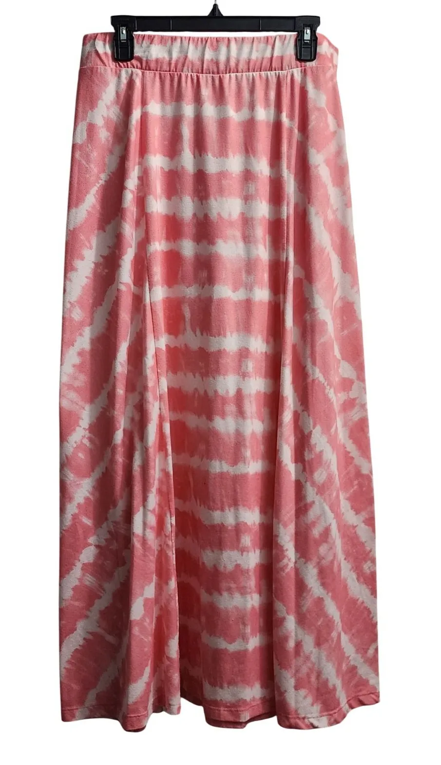 Stylish maxi skirt featuring a trendy pink and white tie-dye pattern. This skirt boasts an elastic waistband for comfortable wear and a relaxed fit. The flowing silhouette is perfect for warm weather, offering both comfort and style. This skirt is ideal for beach outings, summer parties, or casual everyday wear.