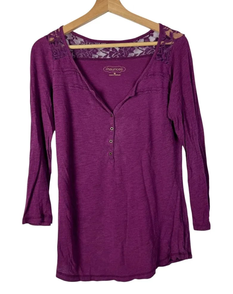 Maurices Purple Lace Shoulder Henley Long Sleeve T-Shirt Good used condition, minimal signs of wear... Show more