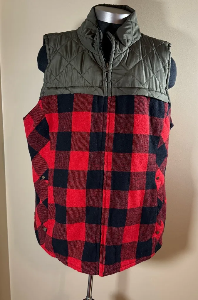 Stylish vest with a red and black plaid pattern. Features an olive green quilted yoke. Perfect for l... Show more