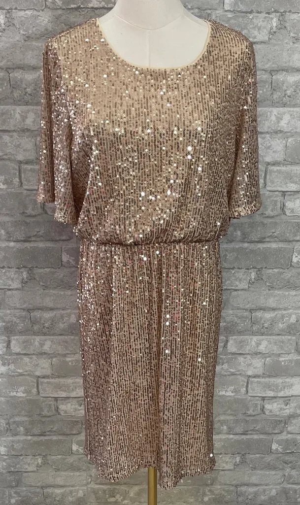 Dazzle in this stunning gold sequin midi dress. Perfect for parties and special events. Features a r... Show more