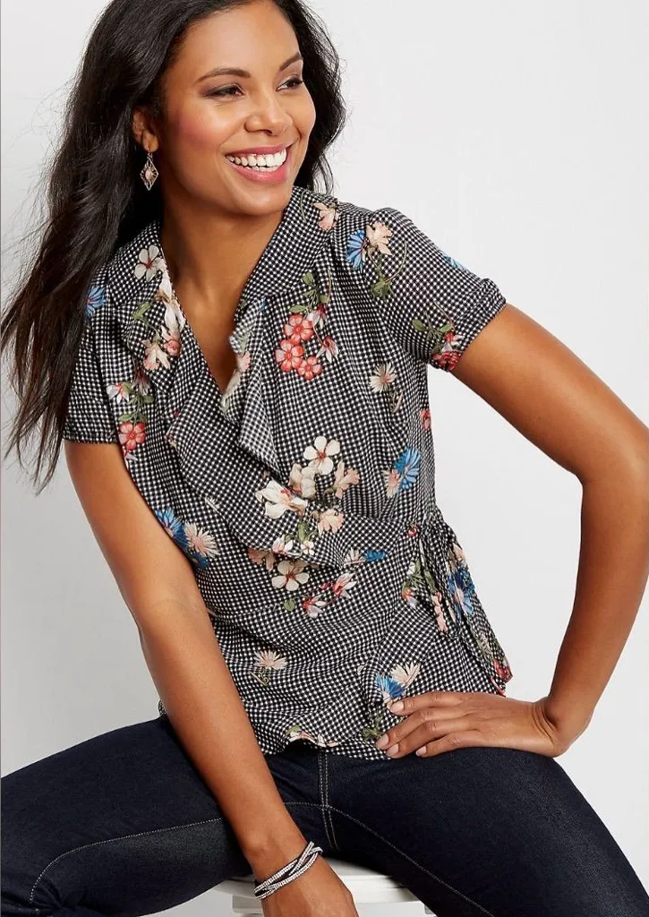 The Maurices Size M Checkered Floral Gingham Wrap Blouse with Cap Sleeves and a Ruffle V-neck is a s... Show more