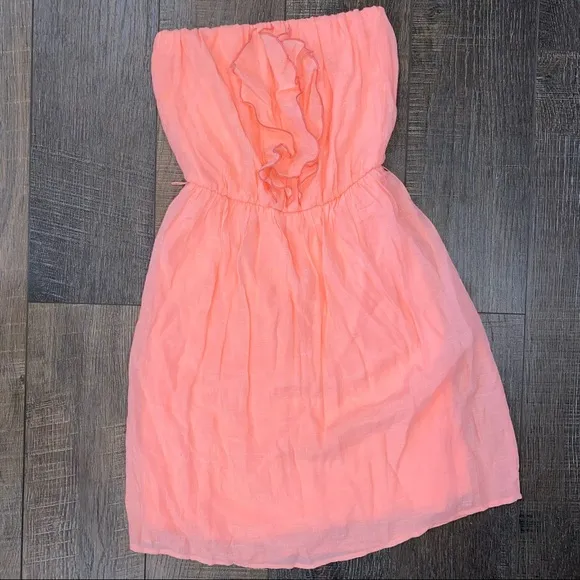 Strapless dress with elastic around the top to keep the dress in place Ruffle accent down the front... Show more