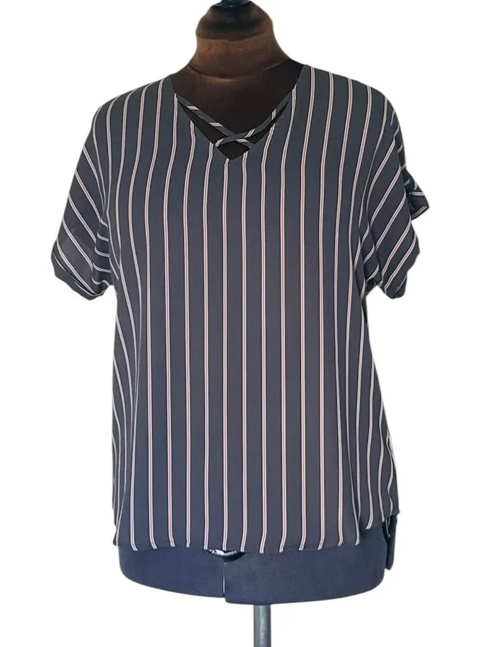 The Maurices Striped Short Sleeve Blouse in Gray with a Crisscross Neckline is a versatile and styli... Show more