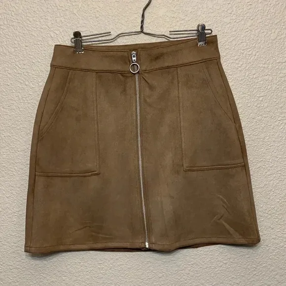 Maurice’s tan faux suede mini skirt sz 4 Approximate measurements waist: 28” Length: 17.5” Style t... Show more