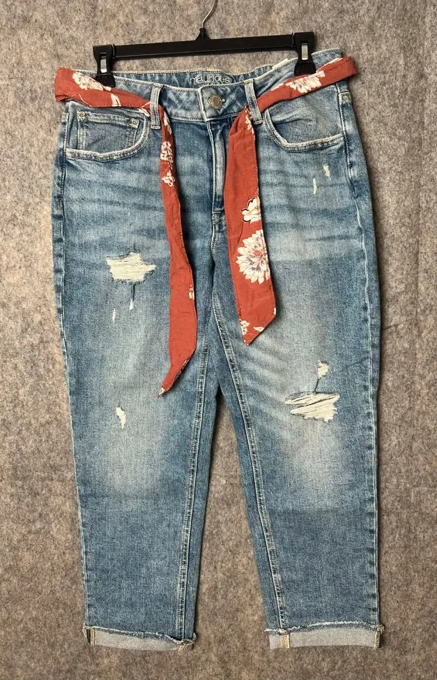 Trendy blue ankle jeans with a red floral tie. Perfect for casual style. In good pre owned condition... Show more