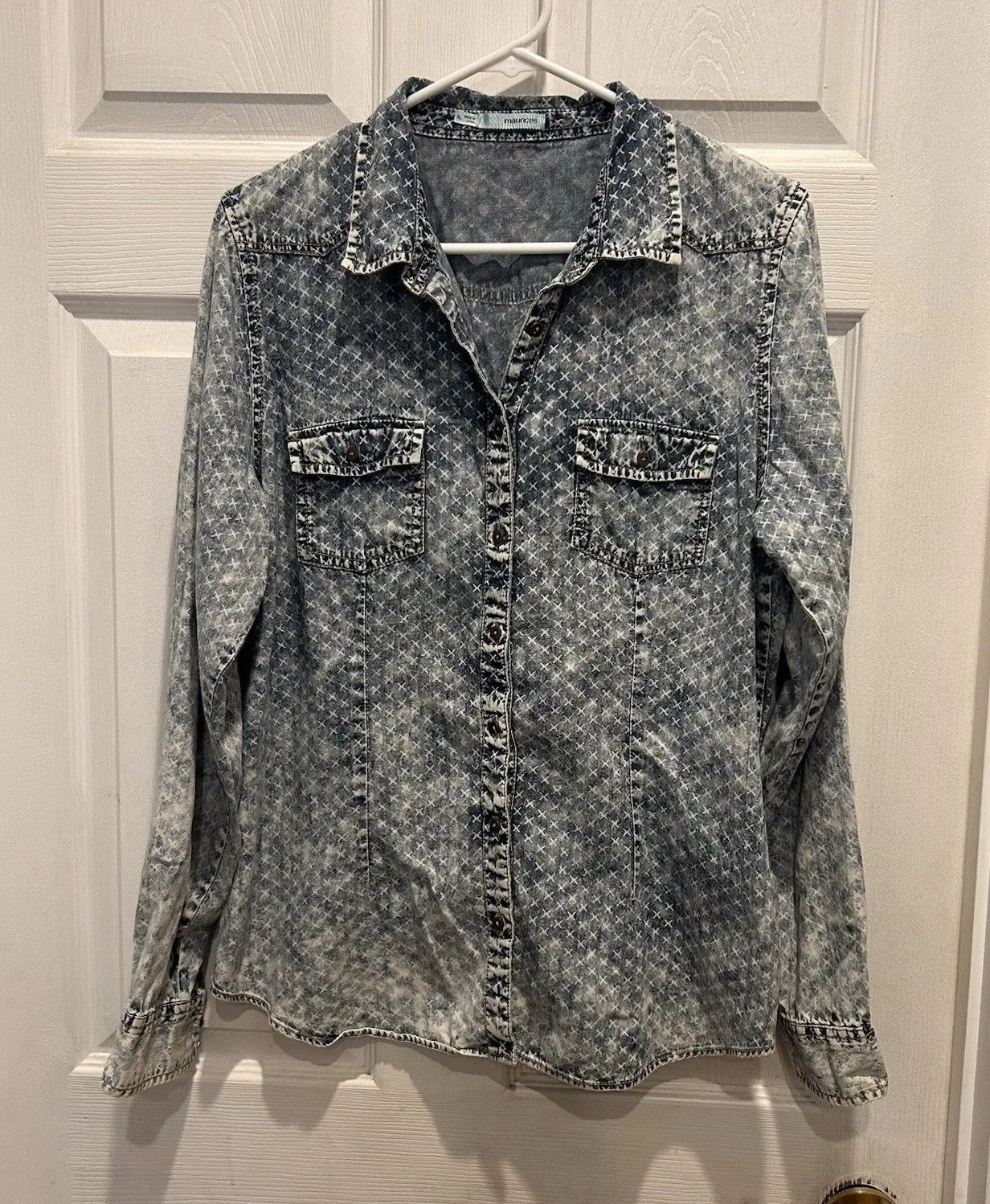 Maurices Women’s Lightweight Denim Acid Wash X Print Long Sleeve Button Down XL Euc. No flaws. Some... Show more