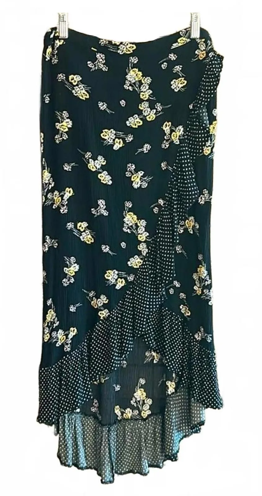 EUC Maurices Maxi Skirt Size M Black Floral Ruffle Hem Faux Wrap EUC - lightweight and flowy chiffo... Show more