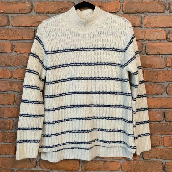 Cozy chunky knit sweater in a classic striped pattern. Features a mock neck design and ribbed textur... Show more