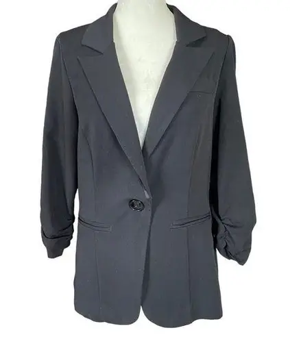 Women’s Maurices black blazer with one large button, cinched sleeves, and three non functional pocke... Show more