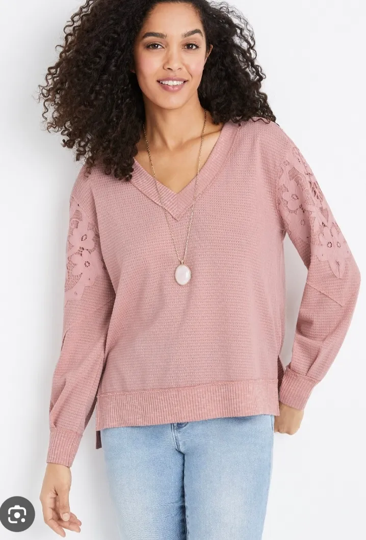 Stylish pink V-neck sweater featuring lace sleeves. Perfect for a casual look.