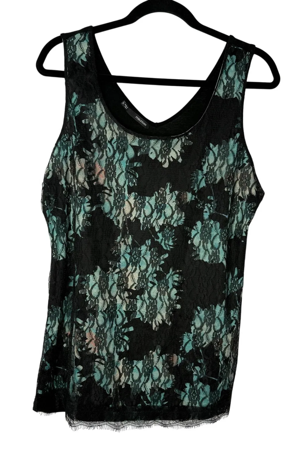 Maurices sleeveless lace overlay tank featuring a sheer black floral lace layer over a teal underlay... Show more