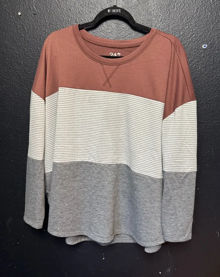 Casual long sleeve top with brown, white, and gray stripes. Perfect for everyday wear. It is in grea... Show more