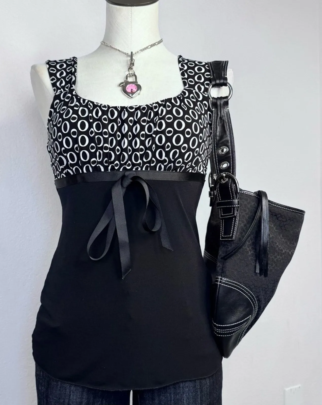 Y2K Babydoll Tank Top Bow Coquette Mod Officecore Geometric Print Feminine Dollette Black and White... Show more