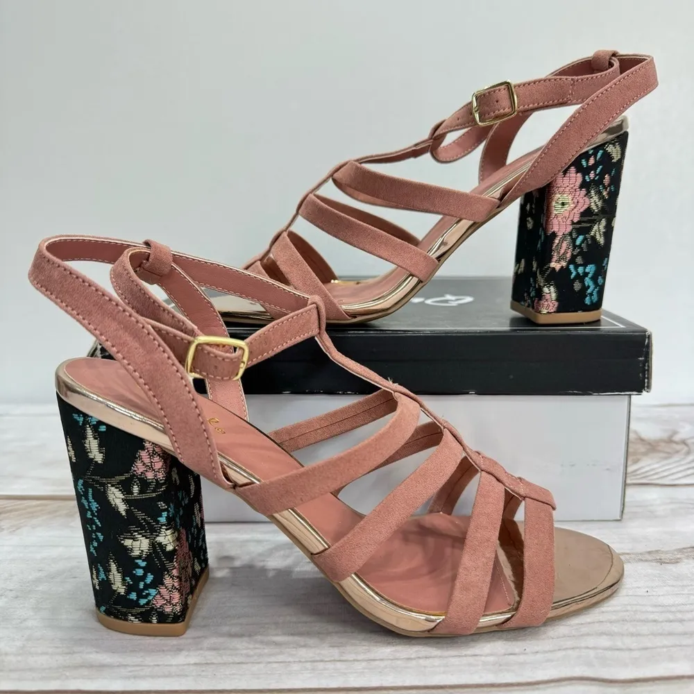 Qupid “Chester” mauve pink faux suede strappy sandals, straps wrap around ankle. Block heels with go... Show more